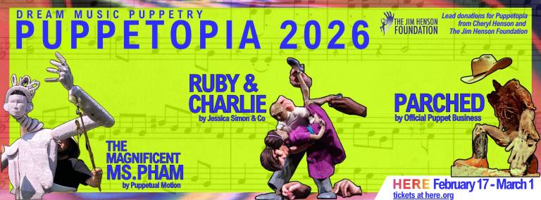 PUPPETOPIA! Returns for two weeks. HERE Art Center’s Dream Music Puppetry program, presented with the support of The Jim Henson Foundation, presents its winter review featuring the world premieres of Parched, Ruby & Charlie, and The Magnificent Ms. Pham. February 17 to March 1.